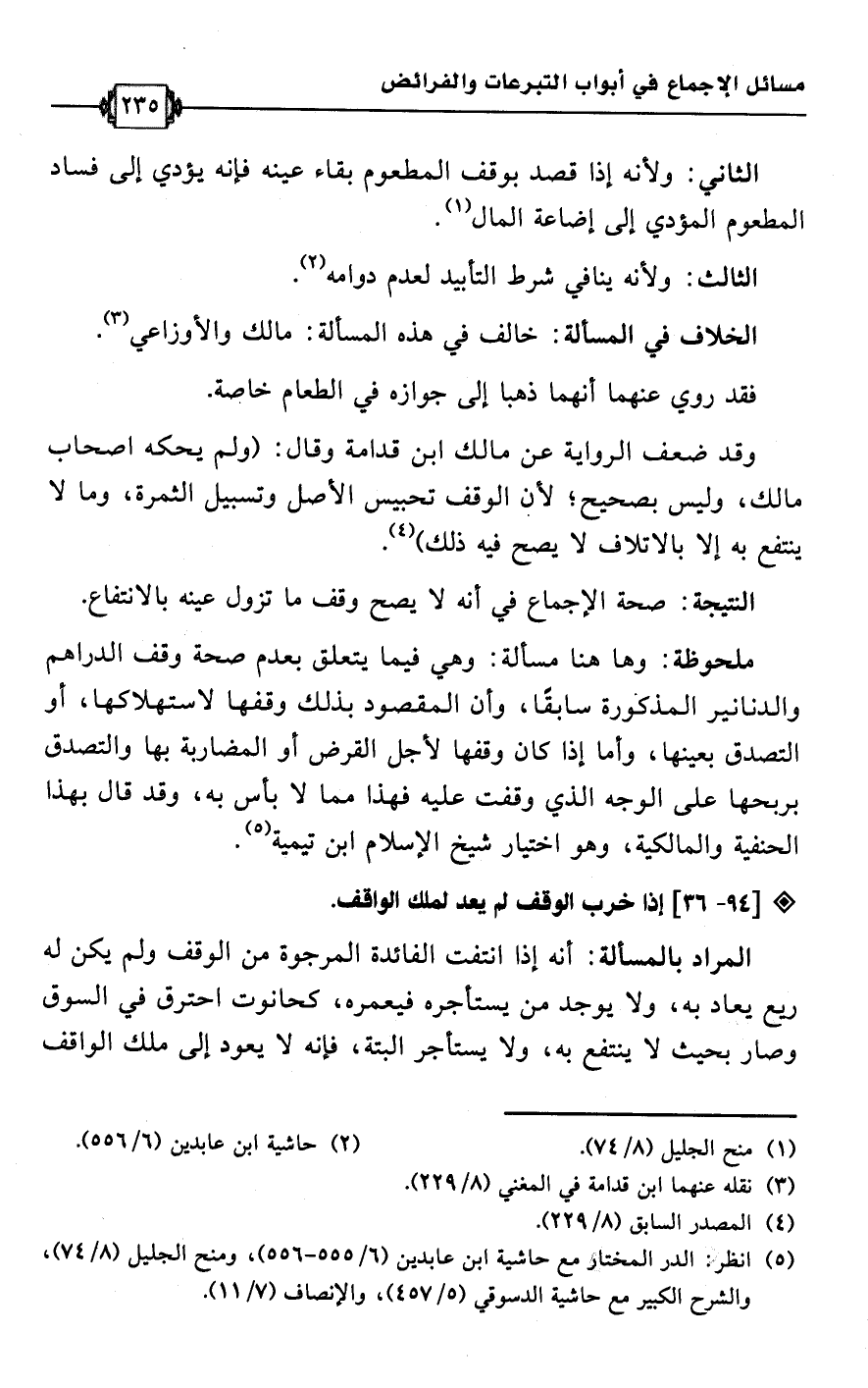 وقد ضعف الرواية عن مالك ابن قدامة وقال: (ولم يحكه أصحاب مالك، وليس بصحيح؛ لأن الوقف تحبيس الأصل وتسبيل الثمرة، وما لا ينتفع به إلا بالإتلاف لا يصح فيه ذلك) (¬4).Rصحة الإجماع في أنه لا يصح وقف ما تزول عينه بالانتفاع.