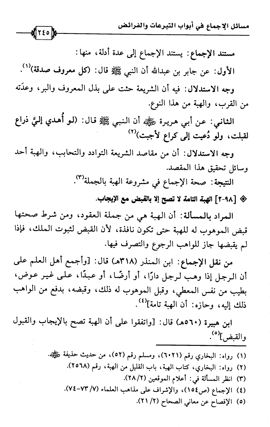 • وجه الاستدلال: أن من مقاصد الشريعة التوادد والتحابب، والهبة أحد وسائل تحقيق هذا المقصد.Rصحة الإجماع في مشروعة الهبة بالجملة (¬3).
