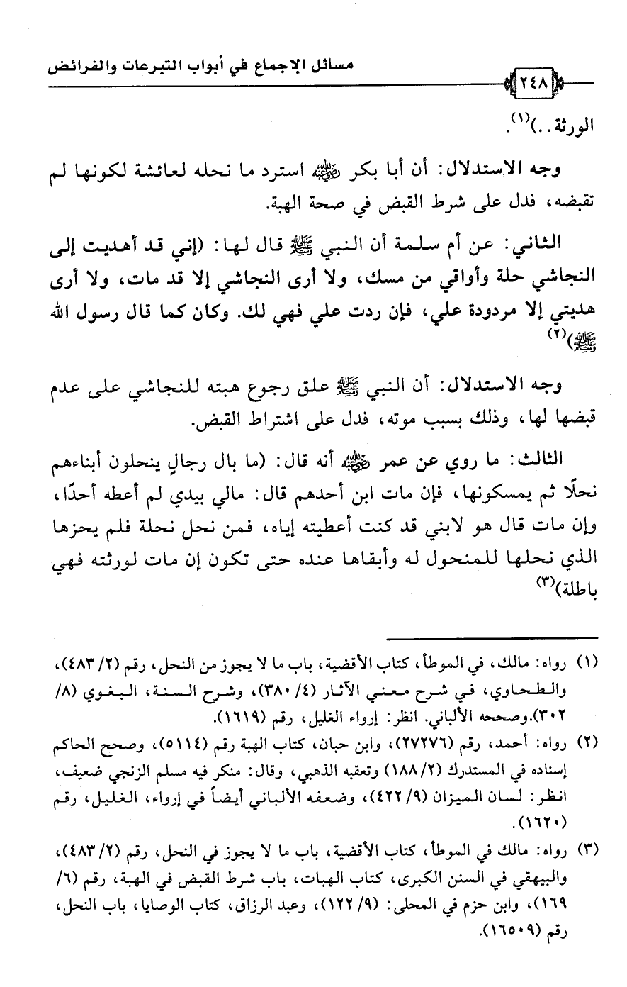 (¬3) رواه: مالك في الموطأ، كتاب الأقضية، باب ما لا يجوز في النحل، رقم (2/ 483)، والبيهقي في السنن الكبرى، كتاب الهبات، باب شرط القبض في الهبة، رقم (6/ 169)، وابن حزم في المحلى: (9/ 122)، وعبد الرزاق، كتاب الوصايا، باب النحل، رقم (16509).