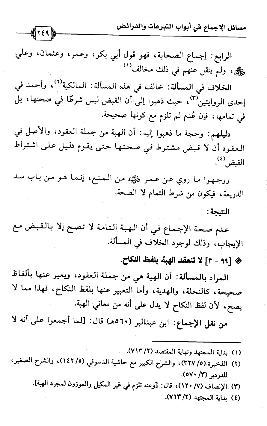 ووجهوا ما روي عن عمر -رضي اللَّه عنه- من المنع، إنما هو من باب سد الذريعة، فيكون من شرط التمام لا الصحة.Rعدم صحة الإجماع في أن الهبة التامة لا تصح إلا بالقبض مع الإيجاب، وذلك لوجود الخلاف في المسألة.