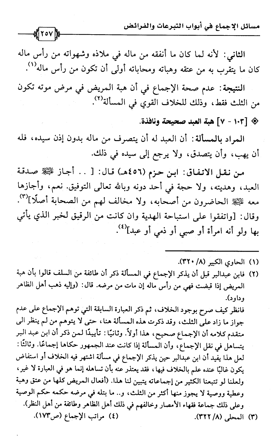 فانظر كيف صرح بوجود الخلاف، ثم ذكر العبارة السابقة التي توهم الإجماع على عدم جواز ما زاد على الثلث، وقد ذكرت هذه المسألة هنا، حتى لا يتوهم من لم ينظر إلى متقدم كلامه أن الإجماع صحيح، هذا أولًا. وثانيًا: تأييدًا لمن ذكر أن ابن عبد البر يتساهل في نقل الإجماع، وأن المسألة إذا كانت عند الجمهور حكاها إجماعًا. وثالثًا: لعل هذا يفيد أن ابن عبد البر حين يذكر الإجماع في مسألة اشتهر فيه الخلاف أو استفاض يكون غالبًا عنده علم بالخلاف فيها، فقد يعتذر عنه بأن تساهله إنما هو في العبارة لا غير، ولعلنا لو تتبعنا الكثير من إجماعاته يتبين لنا هذا. (أفعال المريض كلها من عتق وهبة وعطية ووصية لا يجوز منها أكثر من الثلث، و. . ما بتله في مرضه حكمه حكم الوصية وعلى ذلك جماعة فقهاء الأمصار وخالفهم في ذلك أهل الظاهر وطائفة من أهل النظر).