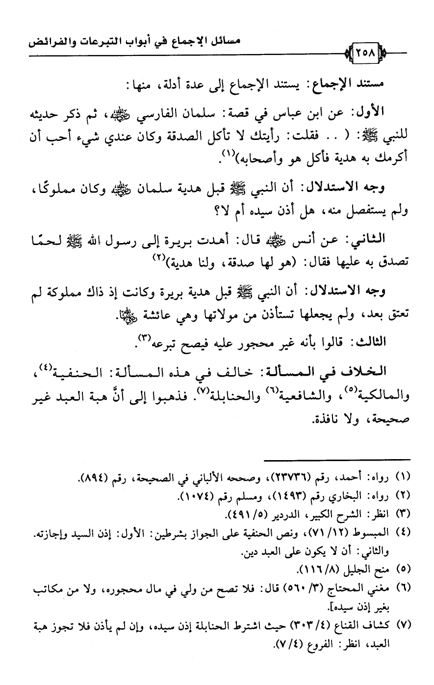 (¬7) كشاف القناع (4/ 303) حيث اشترط الحنابلة إذن سيده، وإن لم يأذن فلا تجوز هبة العبد، انظر: الفروع (4/ 7).