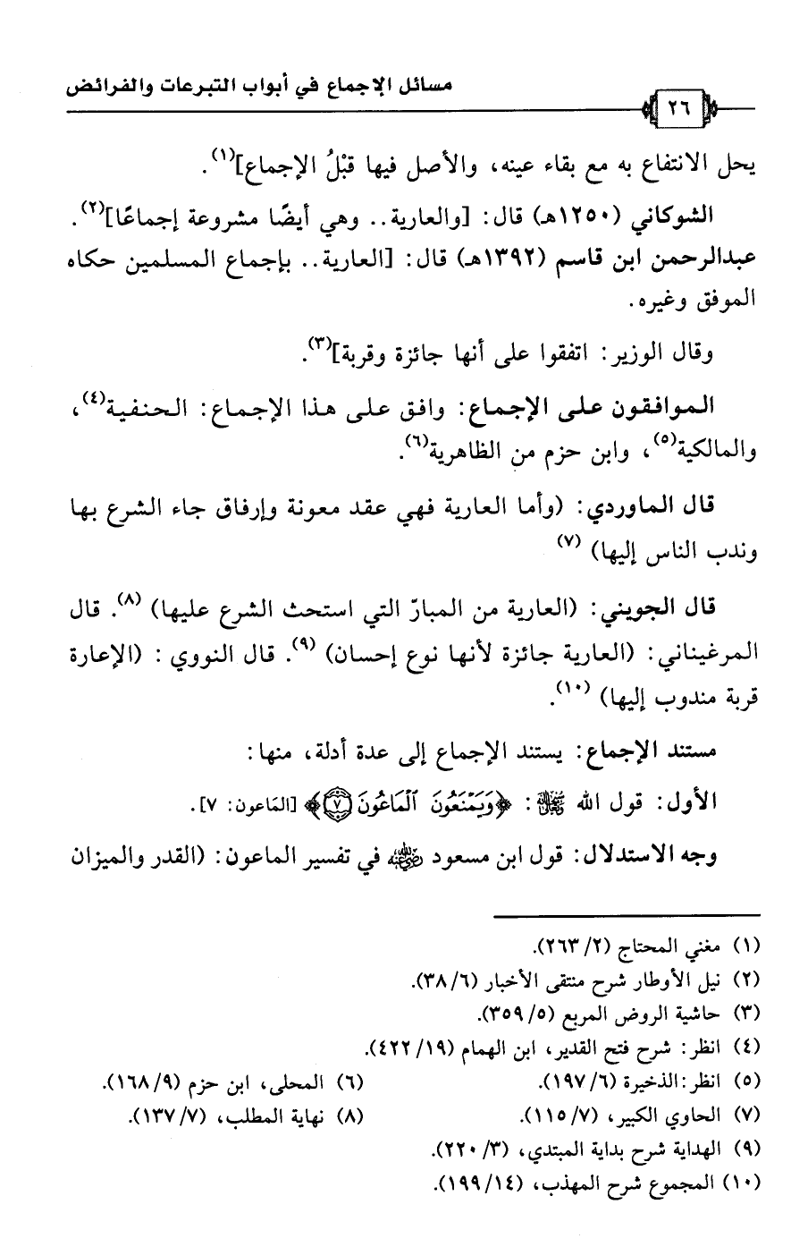 عبد الرحمن ابن قاسم (1392 هـ) قال: [العارية. . بإجماع المسلمين حكاه الموفق وغيره.