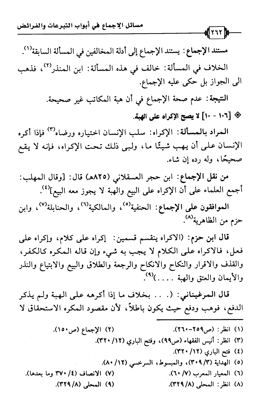 • من نقل الإجماع: ابن حجر العسقلاني (825 هـ) قال: [وقال المهلب: أجمع العلماء على أن الإكراه على البيع والهبة لا يجوز معه البيع] (¬4).