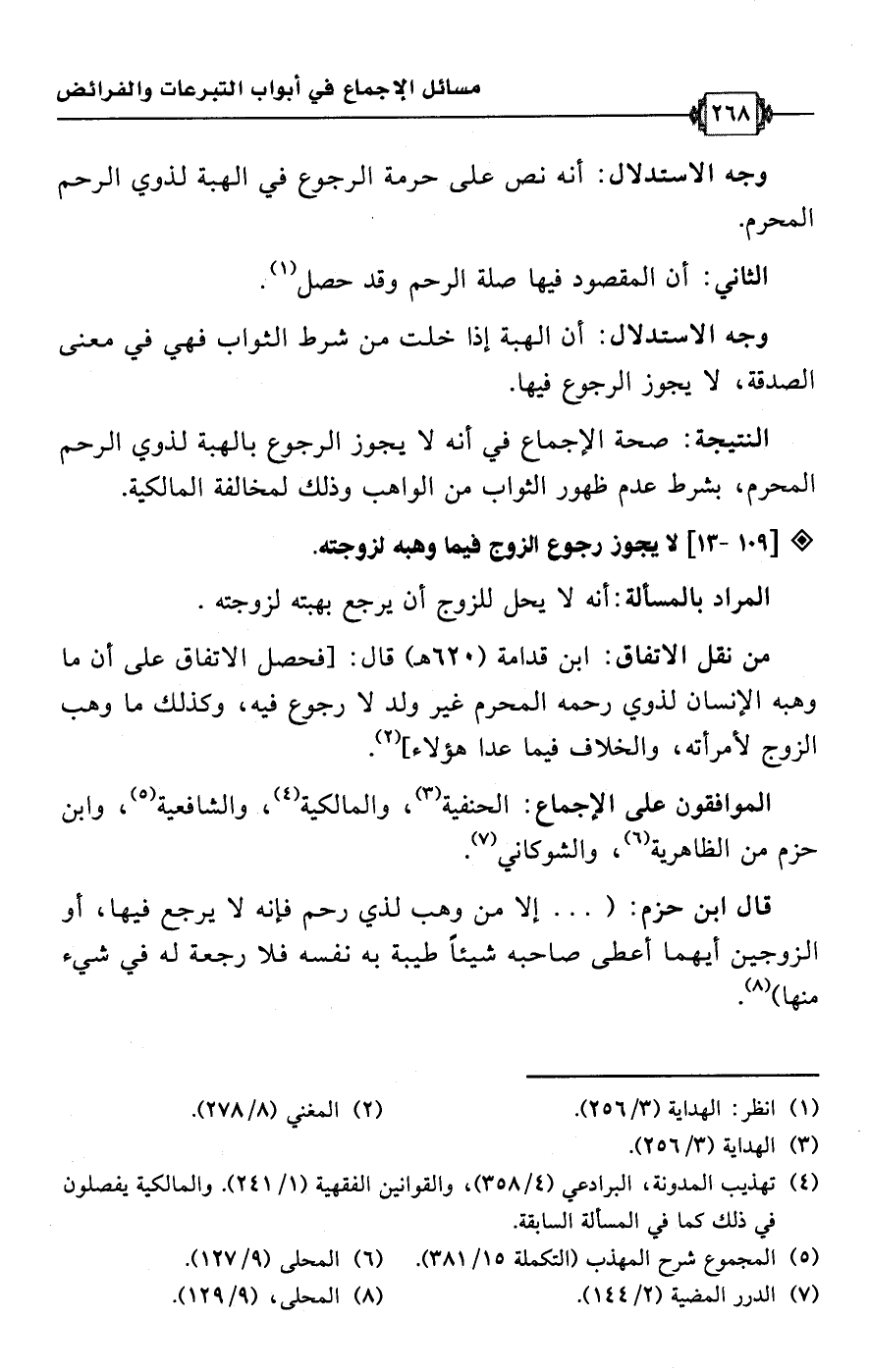 • من نقل الاتفاق: ابن قدامة (620 هـ) قال: [فحصل الاتفاق على أن ما وهبه الإنسان لذوي رحمه المحرم غير ولد لا رجوع فيه، وكذلك ما وهب الزوج لامرأته، والخلاف فيما عدا هؤلاء] (¬2).