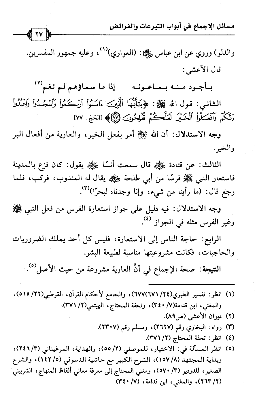 الرابع: حاجة الناس إلى الاستعارة، فليس كل أحد يملك الضروريات والحاجيات، فكانت مشروعيتها مناسبة لطبيعة البشر.Rصحة الإجماع في أن العارية مشروعة من حيث الأصل (¬5).