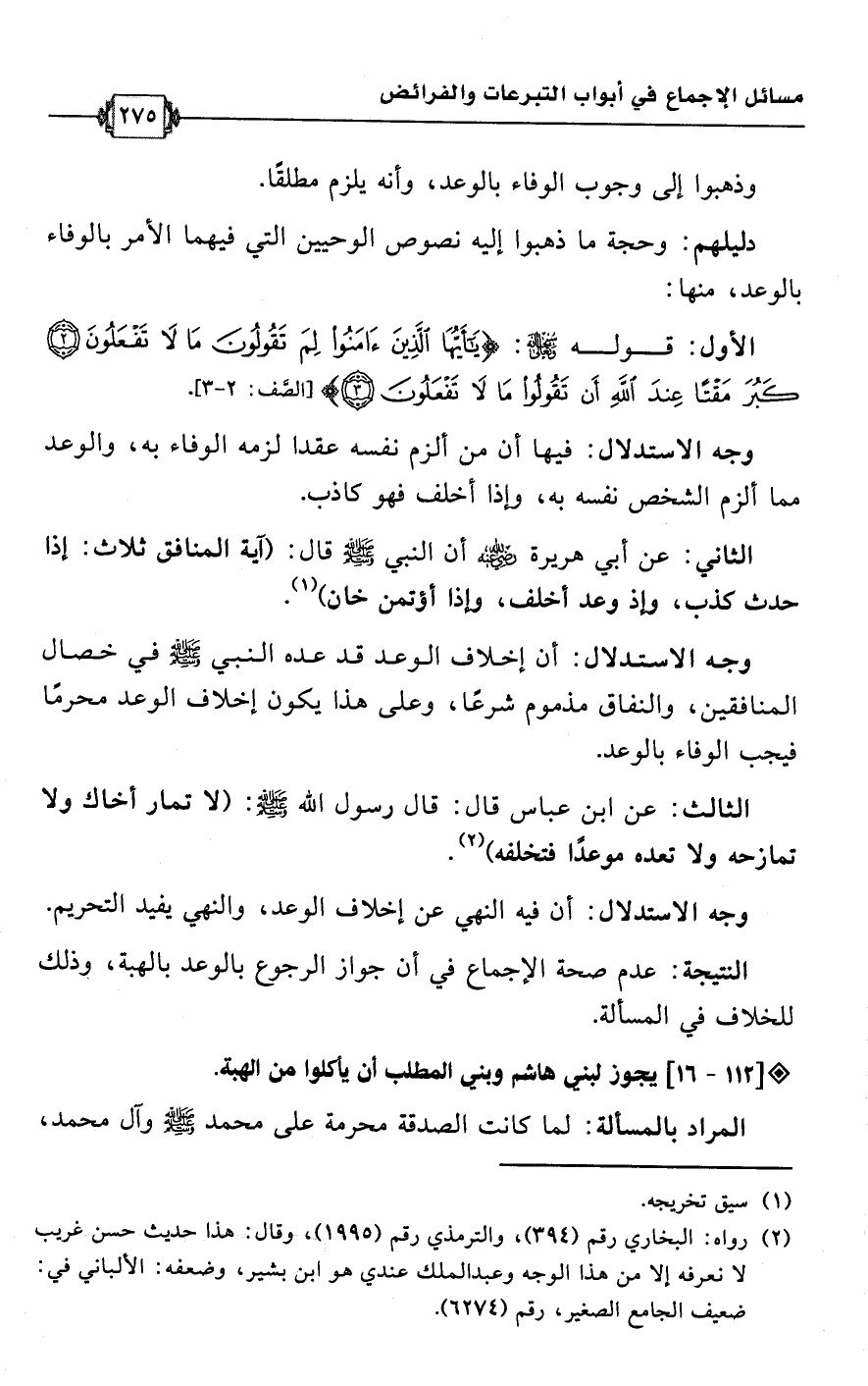 • وجه الاستدلال: أن إخلاف الوعد قد عده النبي -صلى اللَّه عليه وسلم- في خصال المنافقين، والنفاق مذموم شرعًا، وعلى هذا يكون إخلاف الوعد محرمًا فيجب الوفاء بالوعد.