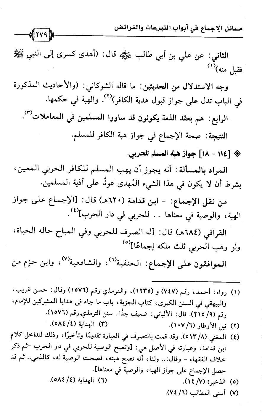 • من نقل الإجماع: ابن قدامة (620 هـ) قال: [الإجماع على جواز الهبة، والوصية في معناها. . للحربي في دار الحرب] (¬4).