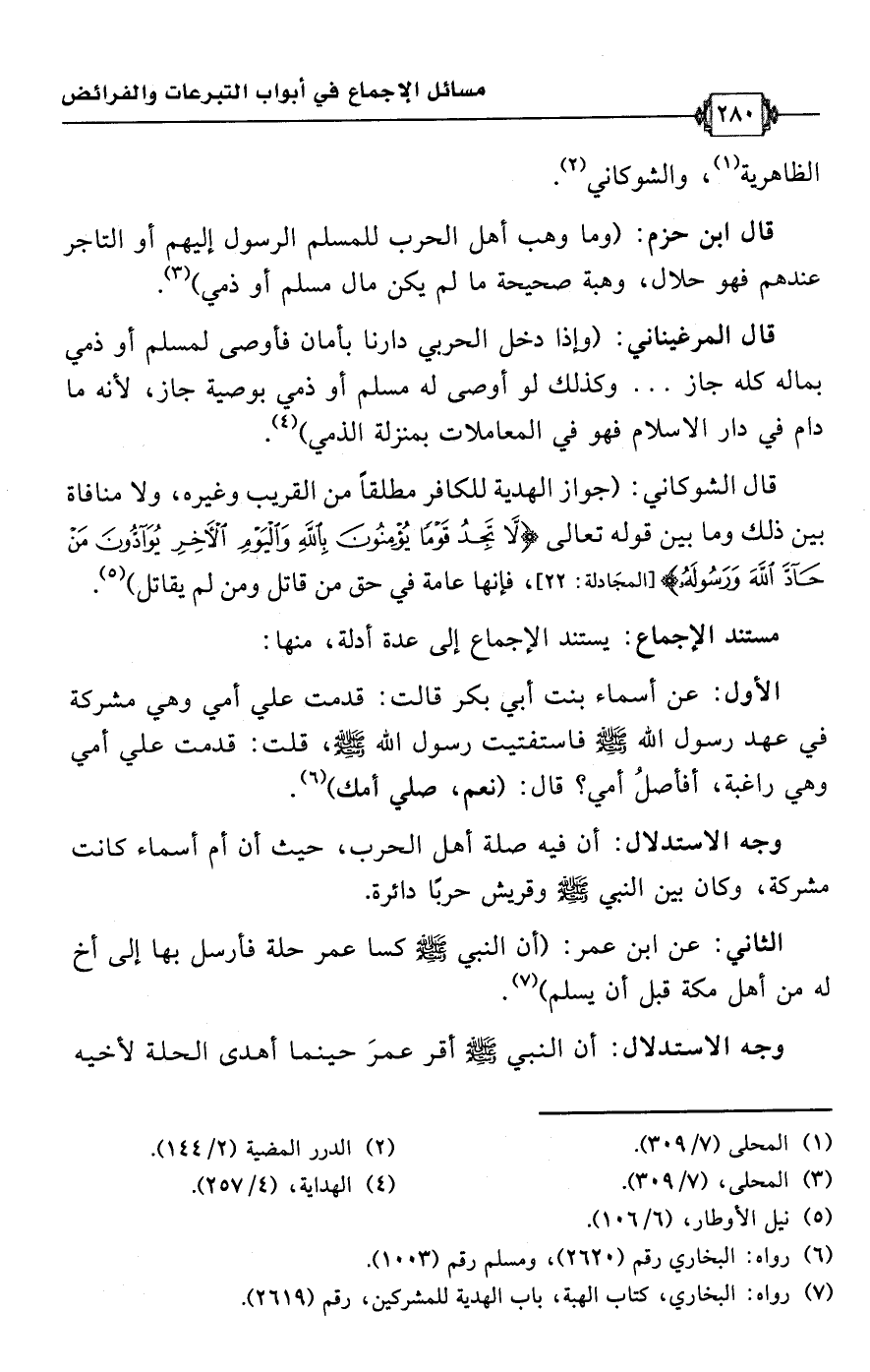 قال ابن حزم: (وما وهب أهل الحرب للمسلم الرسول إليهم أو التاجر عندهم فهو حلال، وهبة صحيحة ما لم يكن مال مسلم أو ذمي) (¬3).