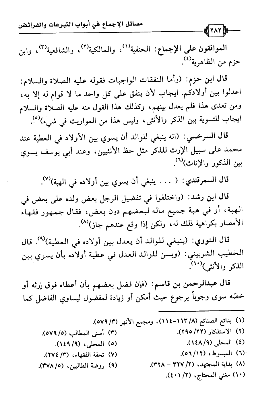 قال ابن حزم: (وأما النفقات الواجبات فقوله عليه الصلاة والسلام: اعدلوا بين أولادكم. ايجاب لأن ينفق على كل واحد ما لا قوام له إلا به، ومن تعدى هذا فلم يعدل بينهم، وكذلك هذا القول منه عليه الصلاة والسلام إيجاب للتسوية بين الذكر والأنثى، وليس هذا من المواريث في شيء) (¬5).