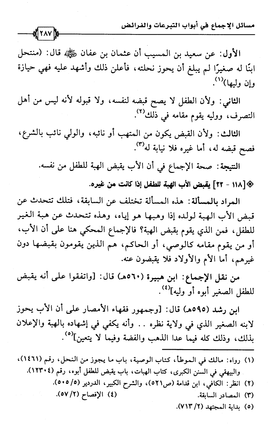 • من نقل الإجماع: ابن هبيرة (560 هـ) قال: [واتفقوا على أنه يقبض للطفل الصغير أبوه أو وليه] (¬4).