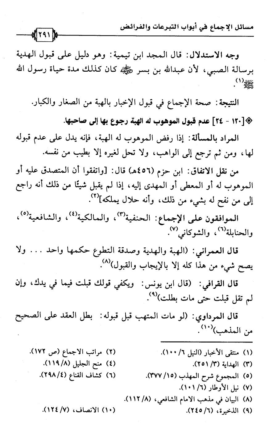 • من نقل الاتفاق: ابن حزم (456 هـ) قال: [واتفقوا أن المتصدق عليه أو الموهوب له أو المعطى أو المهدى إليه، إذا لم يقبل شيئًا من ذلك أنه راجع إلى من نفح له بشيء من ذلك، وأنه حلال يملكه] (¬2).