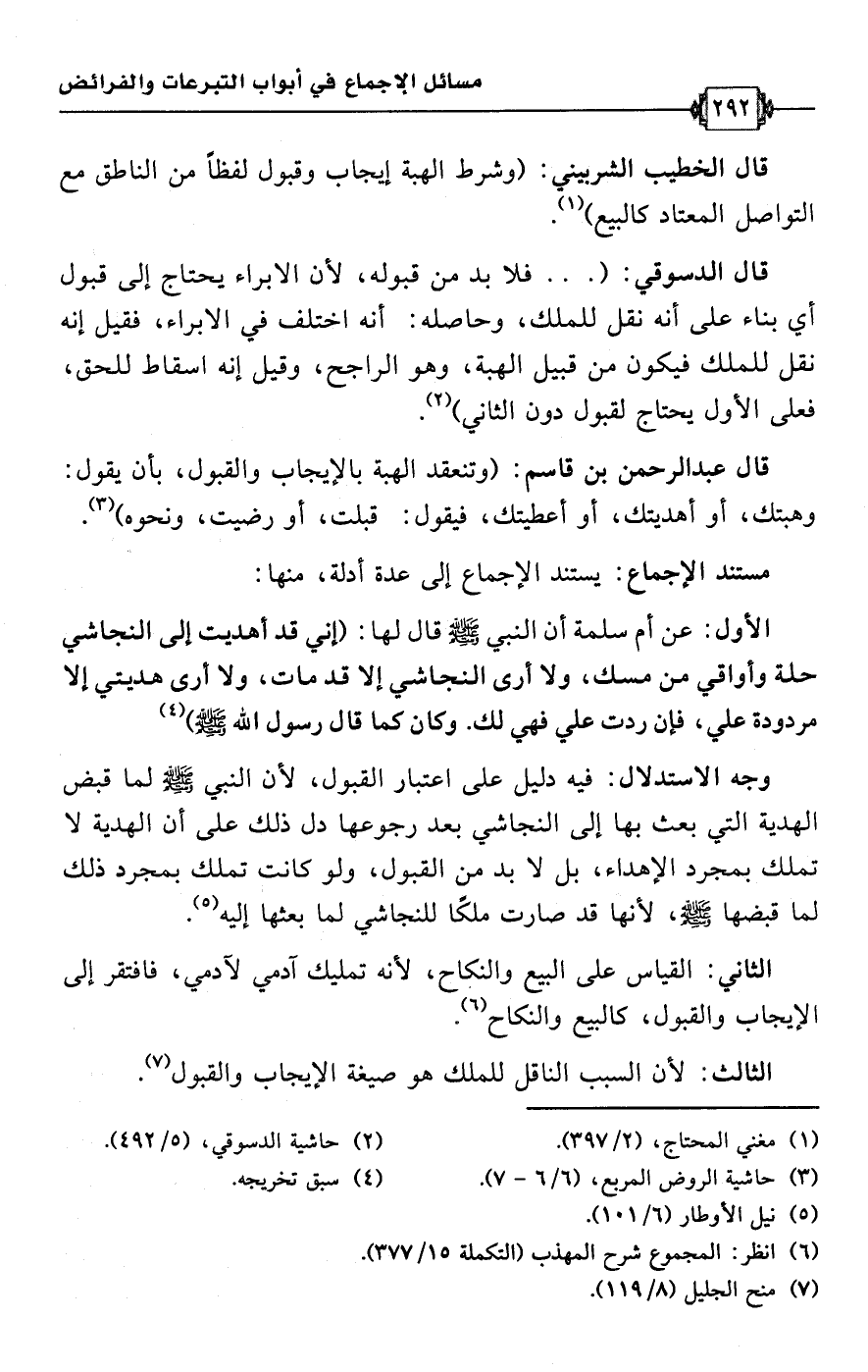 • وجه الاستدلال: فيه دليل على اعتبار القبول، لأن النبي -صلى اللَّه عليه وسلم- لما قبض الهدية التي بعث بها إلى النجاشي بعد رجوعها دل ذلك على أن الهدية لا تملك بمجرد الإهداء، بل لا بد من القبول، ولو كانت تملك بمجرد ذلك لما قبضها -صلى اللَّه عليه وسلم-، لأنها قد صارت ملكًا للنجاشي لما بعثها إليه (¬5).