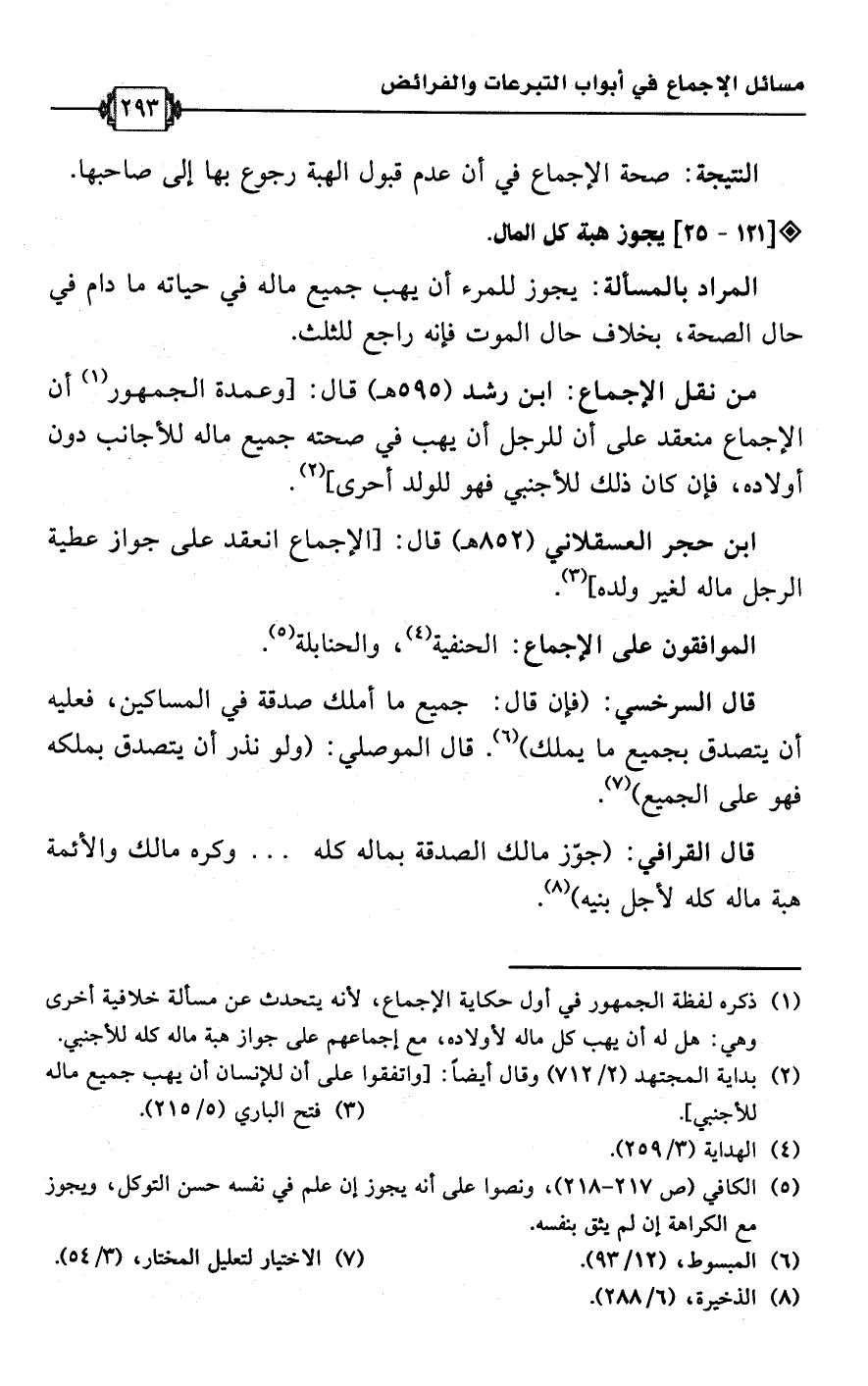 (¬2) بداية المجتهد (2/ 712) وقال أيضًا: [واتفقوا على أن للإنسان أن يهب جميع ماله للأجنبي].