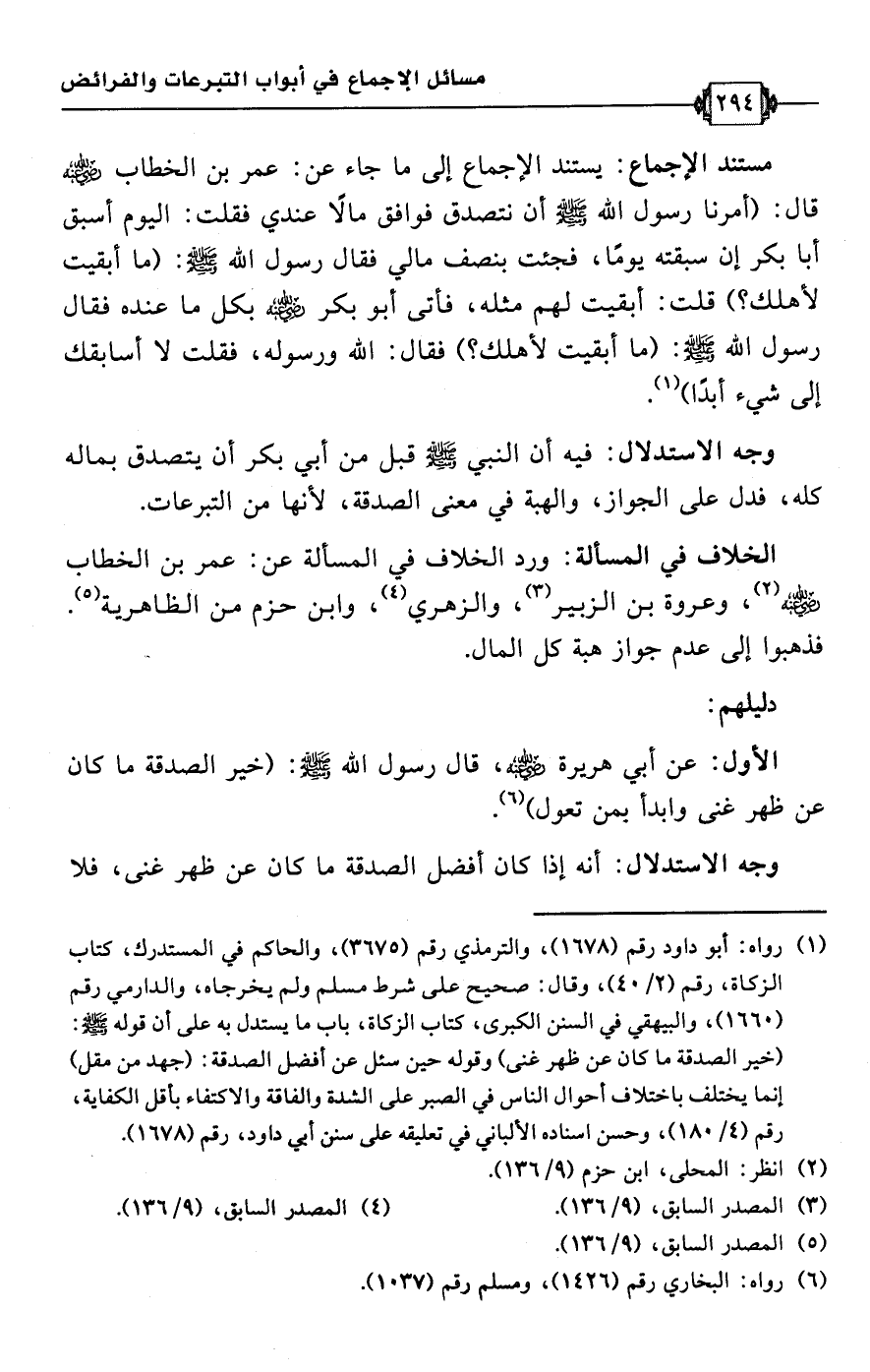 • مستند الإجماع: يستند الإجماع إلى ما جاء عن: عمر بن الخطاب -رضي اللَّه عنه- قال: (أمرنا رسول اللَّه -صلى اللَّه عليه وسلم- أن نتصدق فوافق مالًا عندي فقلت: اليوم أسبق أبا بكر إن سبقته يومًا، فجئت بنصف مالي فقال رسول اللَّه -صلى اللَّه عليه وسلم-: (ما أبقيت لأهلك؟ ) قلت: أبقيت لهم مثله، فأتى أبو بكر -رضي اللَّه عنه- بكل ما عنده فقال رسول اللَّه -صلى اللَّه عليه وسلم-: (ما أبقيت لأهلك؟ ) فقال: اللَّه ورسوله، فقلت لا أسابقك إلى شيء أبدًا) (¬1).