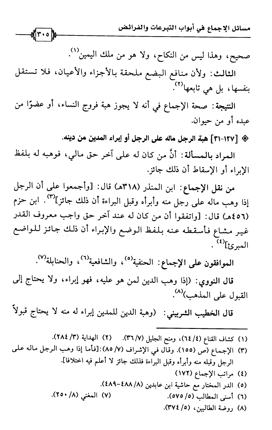 (¬3) الإجماع (ص 155). وقال في الإشراف (7/ 85): [فاما إذا وهب الرجل ماله على الرجل وقبله منه وأبرأه وقبل البراءة فذلك جائز لا أعلم فيه اختلافا].