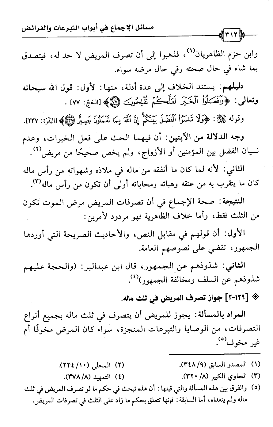 الثاني: لأنه لما كان ما أنفقه من ماله في ملاذه وشهواته من رأس ماله كان ما يتقرب به من عتقه وهباته ومحاباته أولى أن تكون من رأس ماله (¬3).Rصحة الإجماع في أن تصرفات المريض مرض الموت تكون من الثلث فقط، وأما خلاف الظاهرية فهو مردود لأمرين: