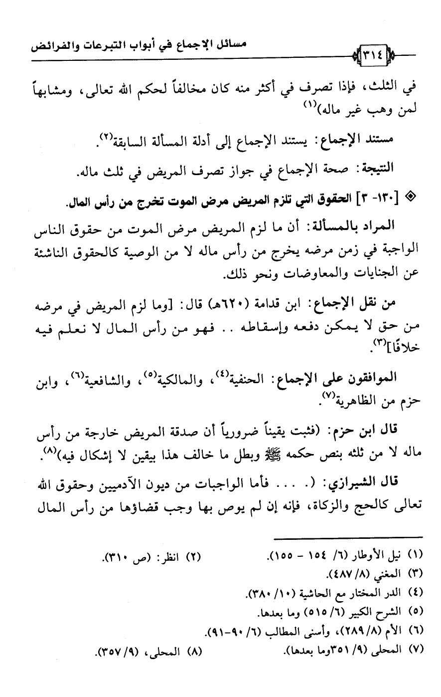 • من نقل الإجماع: ابن قدامة (620 هـ) قال: [وما لزم المريض في مرضه من حق لا يمكن دفعه وإسقاطه. . فهو من رأس المال لا نعلم فيه خلافًا] (¬3).