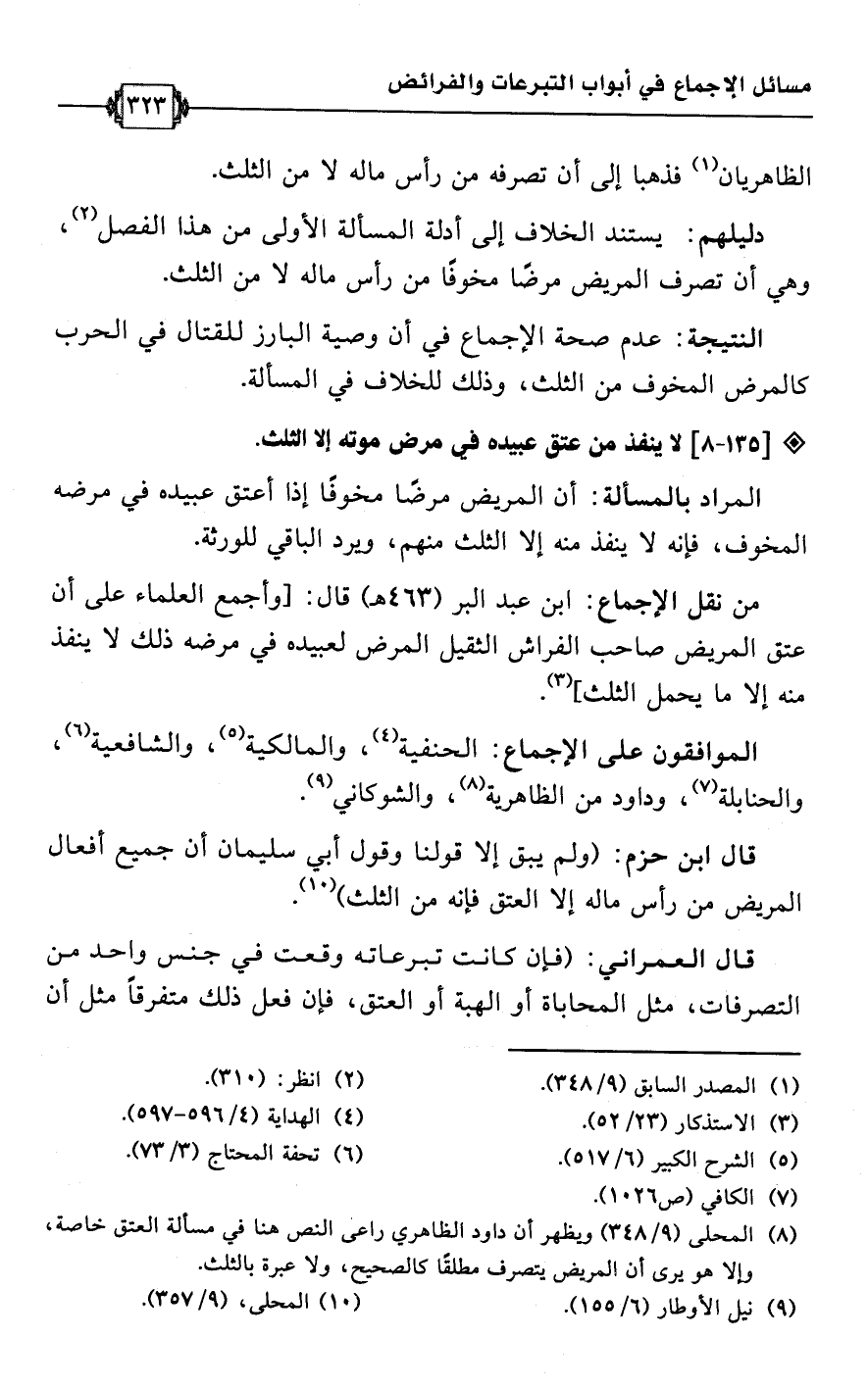• من نقل الإجماع: ابن عبد البر (463 هـ) قال: [وأجمع العلماء على أن عتق المريض صاحب الفراش الثقيل المرض لعبيده في مرضه ذلك لا ينفذ منه إلا ما يحمل الثلث] (¬3).