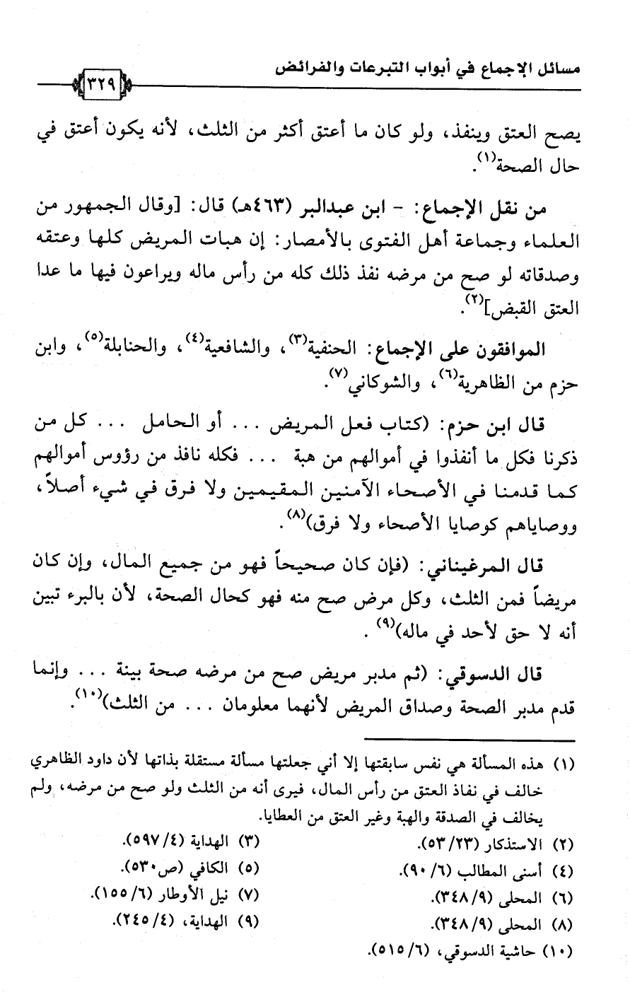 • من نقل الإجماع: ابن عبد البر (463 هـ) قال: [وقال الجمهور من العلماء وجماعة أهل الفتوى بالأمصار: إن هبات المريض كلها وعتقه وصدقاته لو صح من موضه نفذ ذلك كله من رأس ماله ويراعون فيها ما عدا العتق القبض] (¬2).
