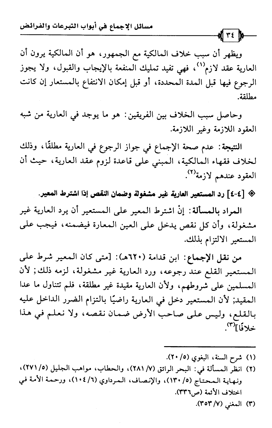 وحاصل سبب الخلاف بين الفريقين: هو ما يوجد في العارية من شبه العقود اللازمة وغير اللازمة.Rعدم صحة الإجماع في جواز الرجوع في العارية مطلقًا، وذلك لخلاف فقهاء المالكية، المبني على قاعدة لزوم عقد العارية، حيث أن العقود عندهم لازمة (¬2).