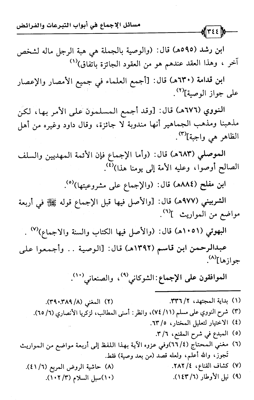 عبد الرحمن ابن قاسم (1392 هـ) قال: [الوصية. . وأجمعوا على جوازها] (¬8).