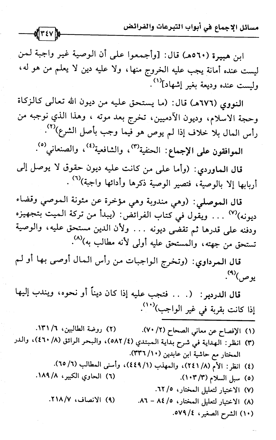 النووي (676 هـ) قال: (ما يستحق عليه من ديون اللَّه تعالى كالزكاة وحجة الإسلام، وديون الآدميين، تخرج بعد موته، وهذا الذي نوجبه من رأس المال بلا خلاف إذا لم يوص هو فيما وجب بأصل الشرع) (¬2).