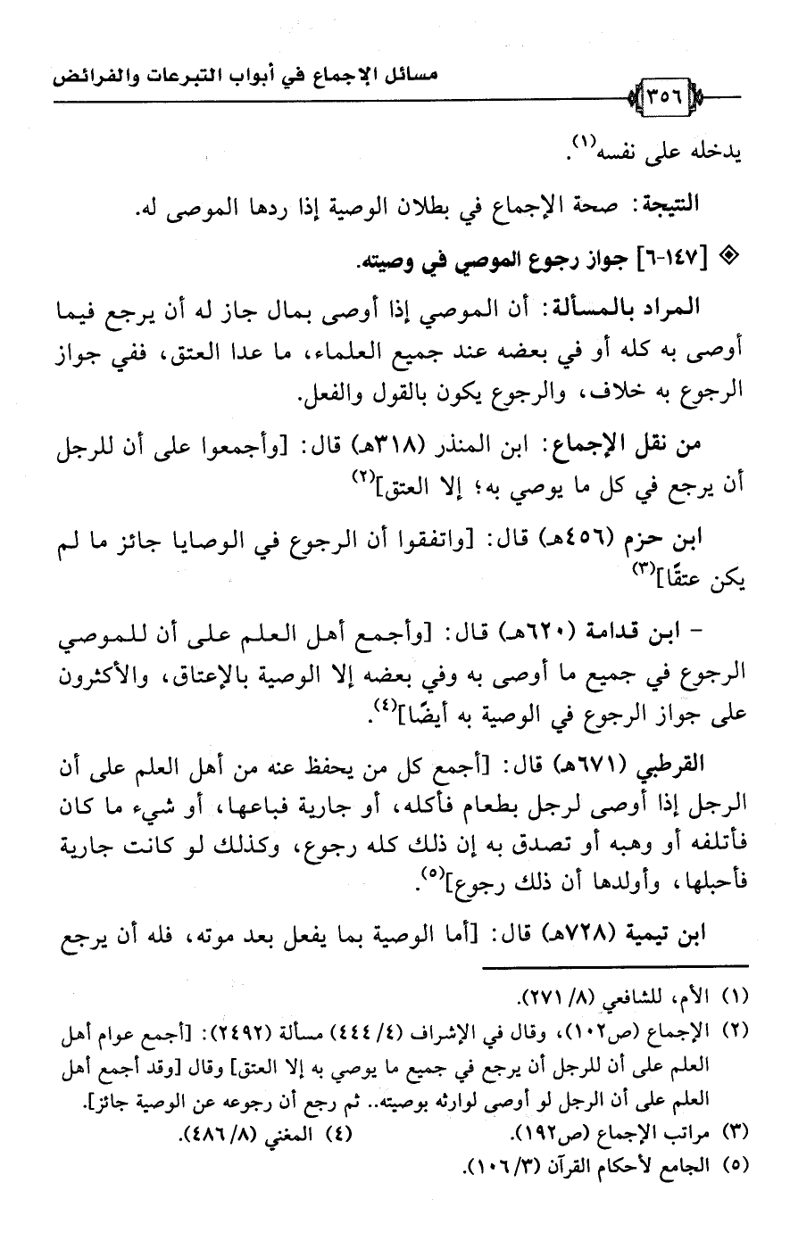 - ابن قدامة (620 هـ) قال: [وأجمع أهل العلم على أن للموصي الرجوع في جميع ما أوصى به وفي بعضه إلا الوصية بالإعتاق، والأكثرون على جواز الرجوع في الوصية به أيضًا] (¬4).