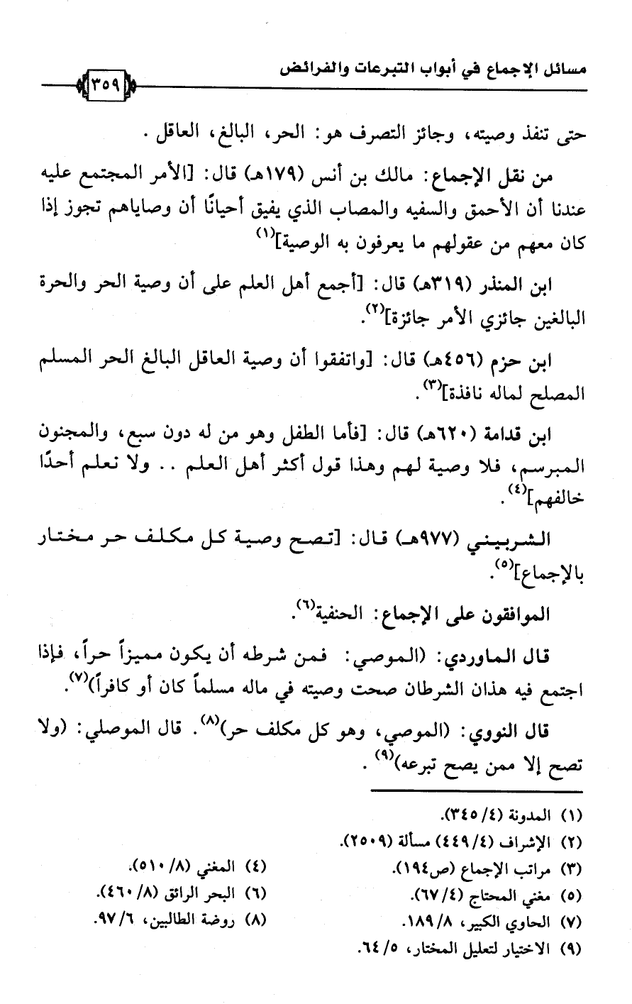 • من نقل الإجماع: مالك بن أنس (179 هـ) قال: [الأمر المجتمع عليه عندنا أن الأحمق والسفيه والمصاب الذي يفيق أحيانًا أن وصاياهم تجوز إذا كان معهم من عقولهم ما يعرفون به الوصية] (¬1).