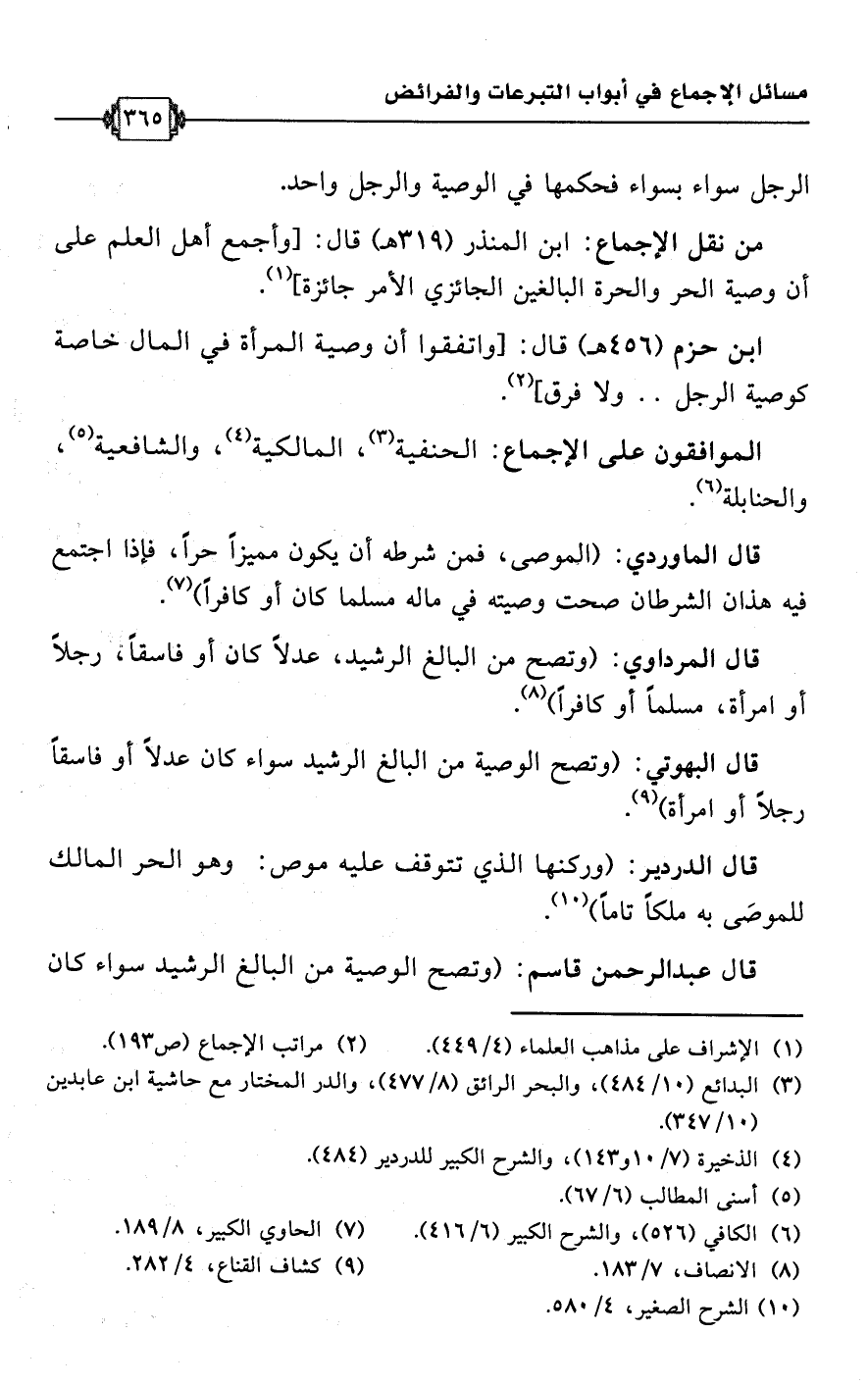 • من نقل الإجماع: ابن المنذر (319 هـ) قال: [وأجمع أهل العلم على أن وصية الحر والحرة البالغين الجائزي الأمر جائزة] (¬1).