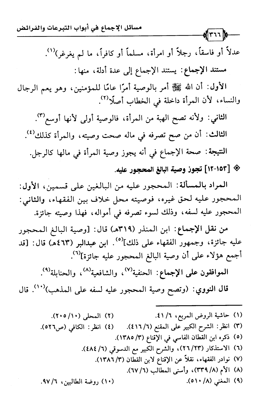 • من نقل الإجماع: ابن المنذر (319 هـ) قال: [وصية البالغ المحجور عليه جائزة، وجمهور الفقهاء على ذلك] (¬5). ابن عبد البر (463 هـ) قال: [قد أجمع هؤلاء على أن وصية البالغ المحجور عليه جائزة] (¬6).
