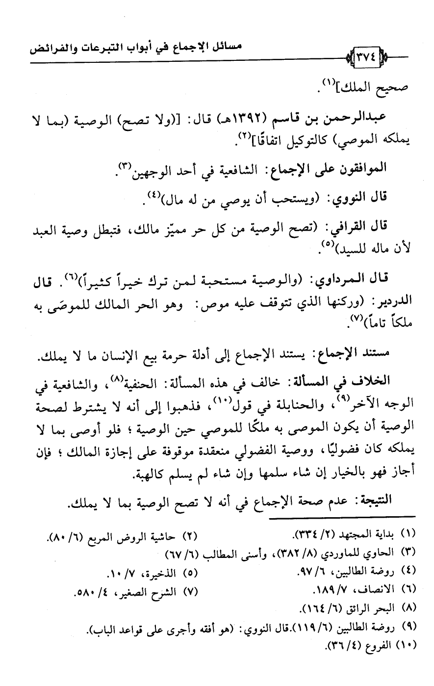 عبد الرحمن بن قاسم (1392 هـ) قال: [(ولا تصح) الوصية (بما لا يملكه الموصي) كالتوكيل اتفاقًا] (¬2).