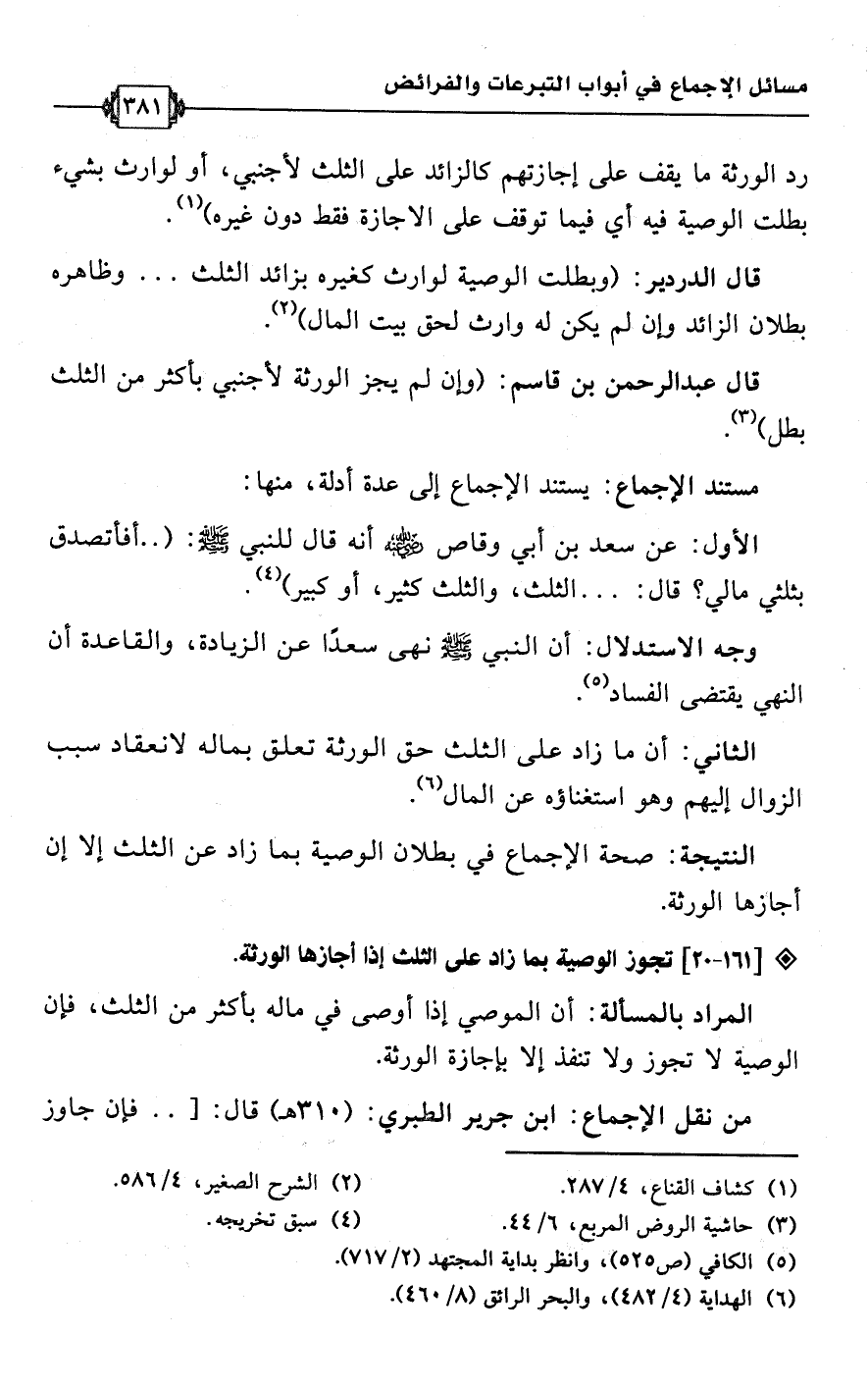 الثاني: أن ما زاد على الثلث حق الورثة تعلق بماله لانعقاد سبب الزوال إليهم وهو استغناؤه عن المال (¬6).Rصحة الإجماع في بطلان الوصية بما زاد عن الثلث إلا إن أجازها الورثة.