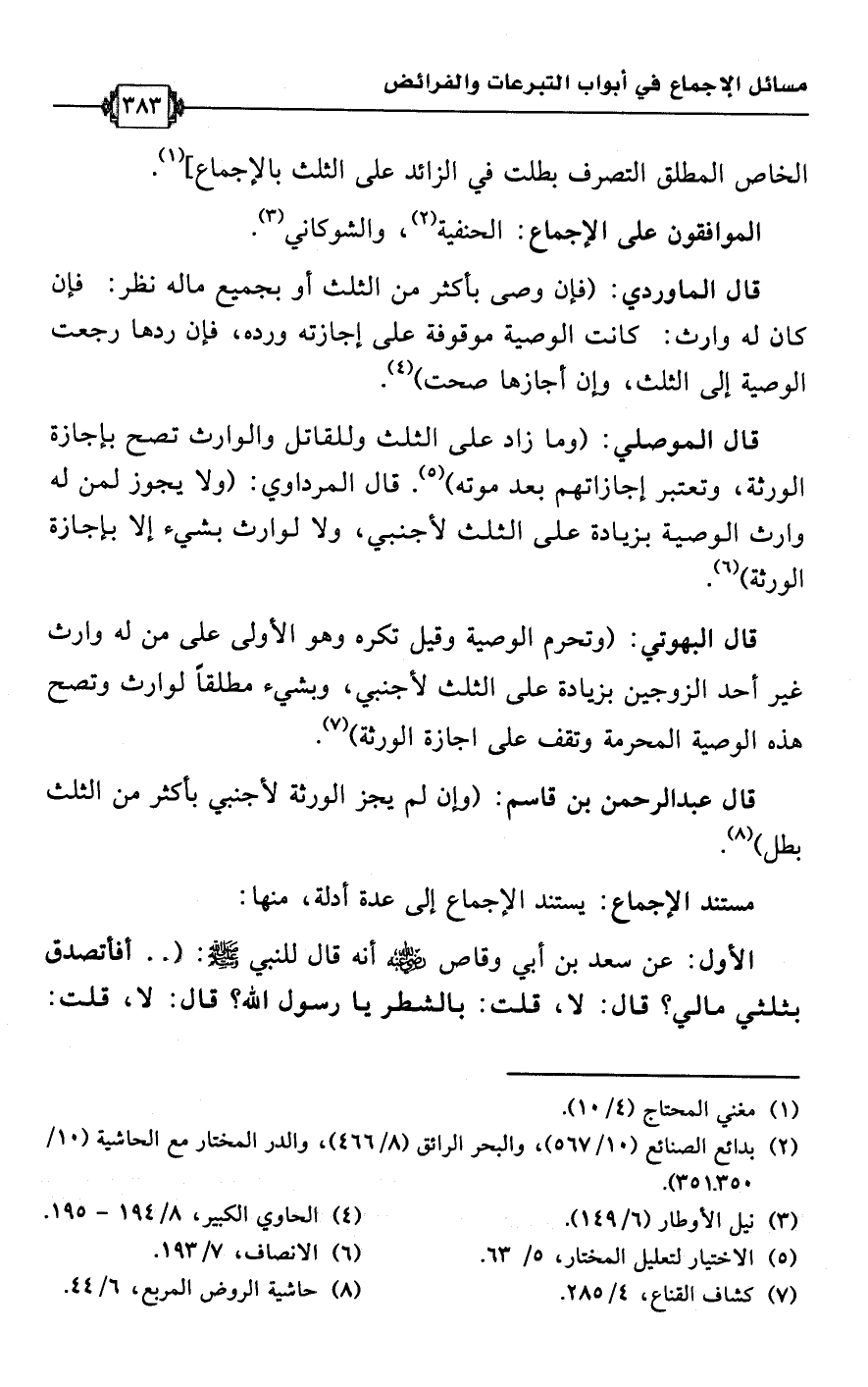 الأول: عن سعد بن أبي وقاص -رضي اللَّه عنه- أنه قال للنبي -صلى اللَّه عليه وسلم-: (. . . أفأتصدق بثلثي مالي؟ قال: لا، قلت: بالشطر يا رسول اللَّه؟ قال: لا، قلت: