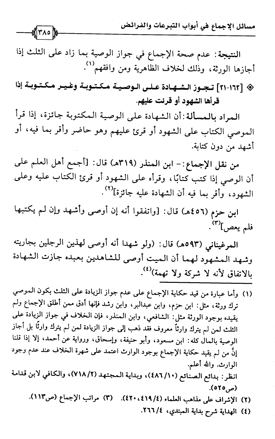 (¬1) وأما عبارة من قيد حكاية الإجماع على عدم جواز الزيادة على الثلث يكون الموصي ترك ورثة، مثل: ابن حزم، وابن عبد البر، وابن رشد فإنها أدق ممن أطلق الإجماع ولم يقيده بوجود الورثة مثل: الشافعي، وابن المنذر، فإن الخلاف في جواز الزيادة على الثلث لمن لم يترك وارثًا معروف فقد ذهب إلى جواز الزيادة لمن لم يترك وارثًا بل أجاز الوصية بالمال كله: ابن مسعود، وأبو حنيفة، وإسحاق، ورواية عن أحمد، إلا إذا قلنا إن من لم يقيد حكاية الإجماع بوجود الوارث اعتمد على شهرة الخلاف عند عدم وجود الوارث. واللَّه أعلم.