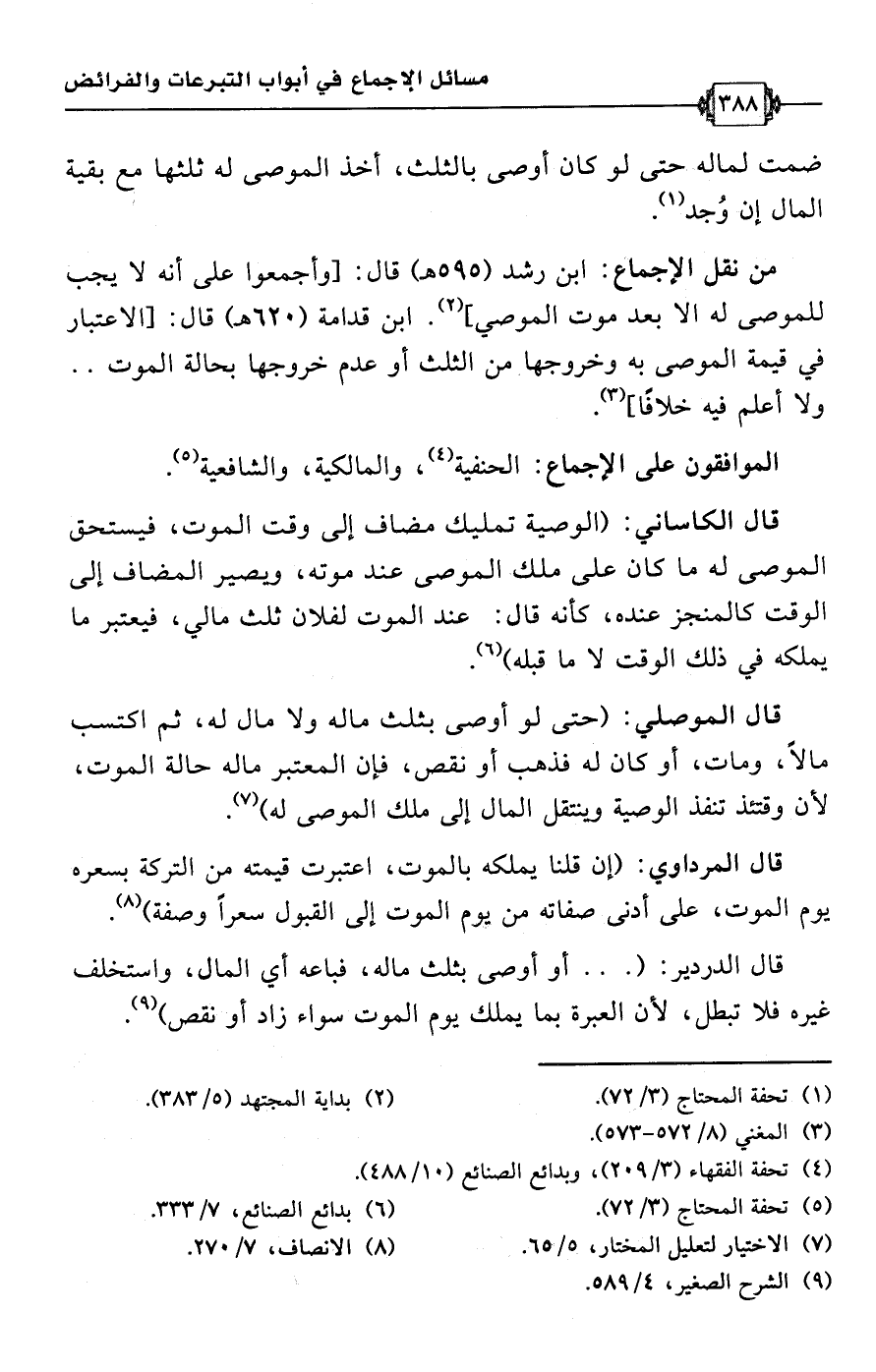 • من نقل الإجماع: ابن رشد (595 هـ) قال: [وأجمعوا على أنه لا يجب للموصى له الا بعد موت الموصي] (¬2). ابن قدامة (620 هـ) قال: [الاعتبار في قيمة الموصى به وخروجها من الثلث أو عدم خروجها بحالة الموت. . ولا أعلم فيه خلافًا] (¬3).