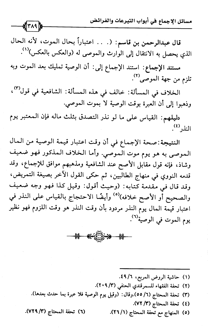 • دليلهم: القياس على ما لو نذر التصدق بثلث ماله فإن المعتبر يوم النذر (¬4).Rصحة الإجماع في أن وقت اعتبار قيمة الوصية من المال الموصى به هو يوم موت الموصي. وأما الخلاف المذكور فهو ضعيف وشاذ، فإنه قول مقابل الأصح عند الشافعية ومذهبهم موافق للإجماع، وقد قدمه النووي في منهاج الطالبين، ثم حكى القول الآخر بصيغة التمريض، وقد قال في مقدمة كتابه: (وحيث أقول: وقيل كذا فهو وجه ضعيف والصحيح أو الأصح خلافه) (¬5) وأيضًا الاحتجاج بالقياس على النذر في اعتبار قيمة المال يوم النذر مردود بأن وقت النذر هو وقت اللزوم فهو نظير يوم الموت في الوصية (¬6).