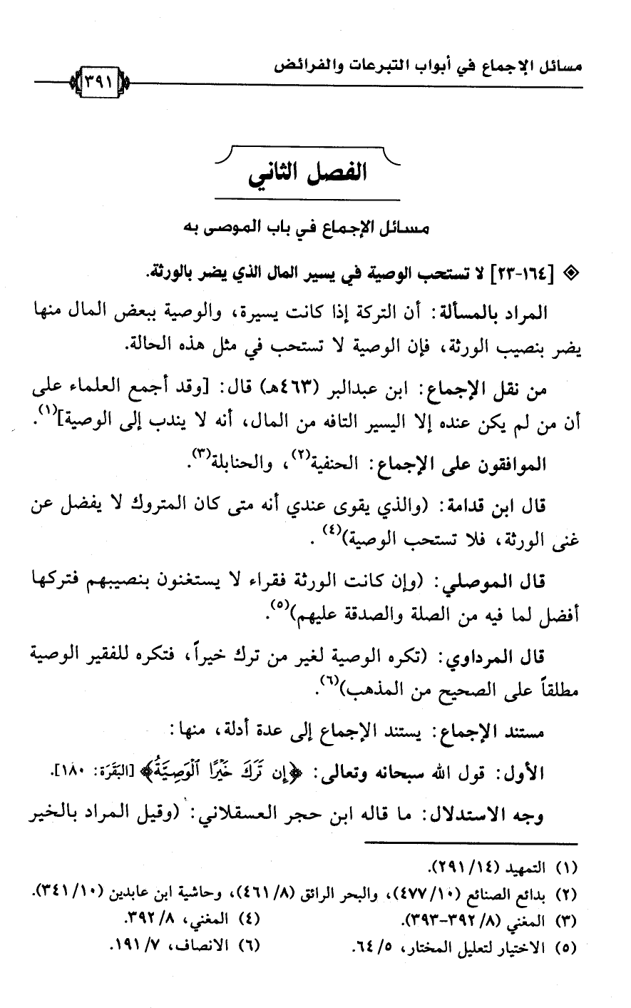 • من نقل الإجماع: ابن عبد البر (463 هـ) قال: [وقد أجمع العلماء على أن من لم يكن عنده إلا اليسير التافه من المال، أنه لا يندب إلى الوصية] (¬1).