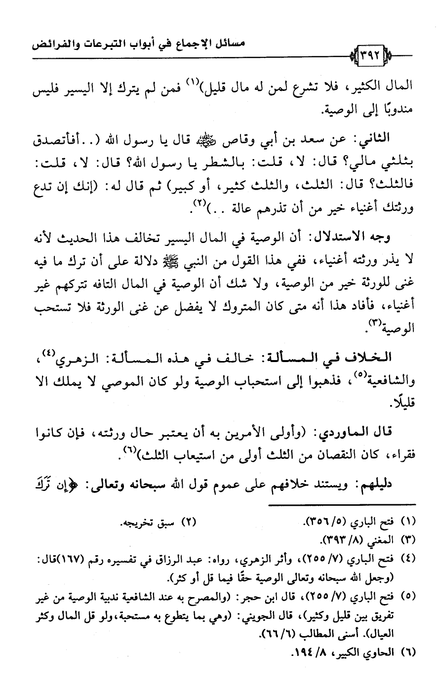 الثاني: عن سعد بن أبي وقاص -رضي اللَّه عنه- قال يا رسول اللَّه (. . أفأتصدق بثلثي مالي؟ قال: لا، قلت: بالشطر يا رسول اللَّه؟ قال: لا، قلت: فالثلث؟ قال: الثلث، والثلث كثير، أو كبير) ثم قال له: (إنك إن تدع ورثتك أغنياء خير من أن تذرهم عالة. .) (¬2).