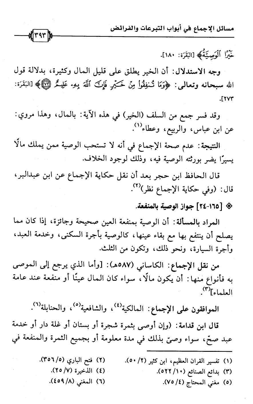 • من نقل الإجماع: الكاساني (587 هـ): [وأما الذي يرجع إلى الموصى به فأنواع منها: أن يكون مالًا، سواء كان المال عينًا أو منفعة عند عامة العلماء] (¬3).