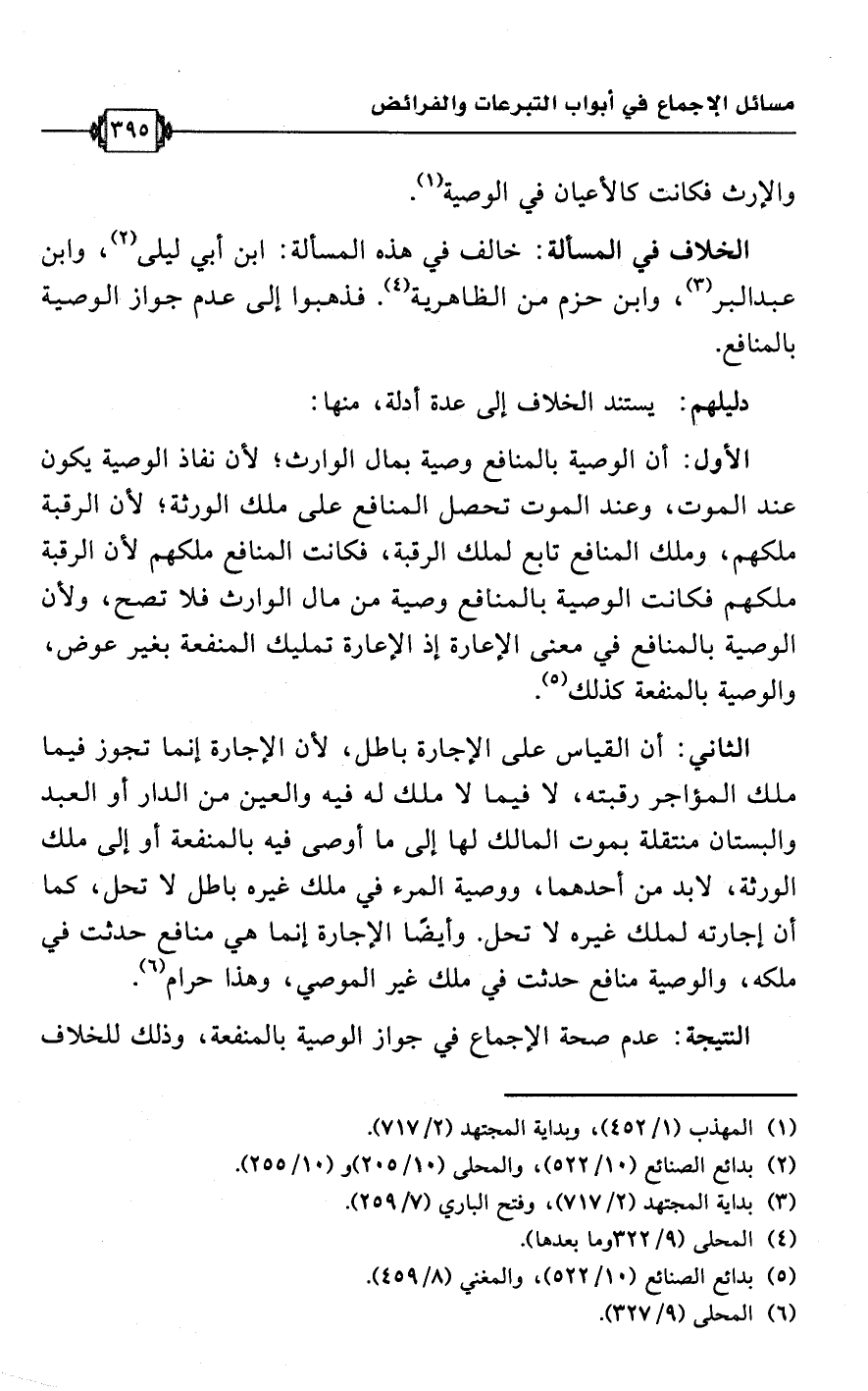 الثاني: أن القياس على الإجارة باطل، لأن الإجارة إنما تجوز فيما ملك المؤاجر رقبته، لا فيما لا ملك له فيه والعين من الدار أو العبد والبستان منتقلة بموت المالك لها إلى ما أوصى فيه بالمنفعة أو إلى ملك الورثة، لابد من أحدهما، ووصية المرء في ملك غيره باطل لا تحل، كما أن إجارته لملك غيره لا تحل. وأيضًا الإجارة إنما هي منافع حدثت في ملكه، والوصية منافع حدثت في ملك غير الموصي، وهذا حرام (¬6).Rعدم صحة الإجماع في جواز الوصية بالمنفعة، وذلك للخلاف
