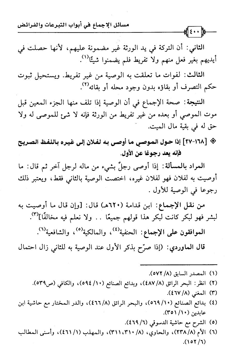 • من نقل الإجماع: ابن قدامة (620 هـ) قال: [وإن قال ما أوصيت به لبشر فهو لبكر كانت لبكر هذا قولهم جميعًا. . ولا نعلم فيه مخالفًا] (¬3).