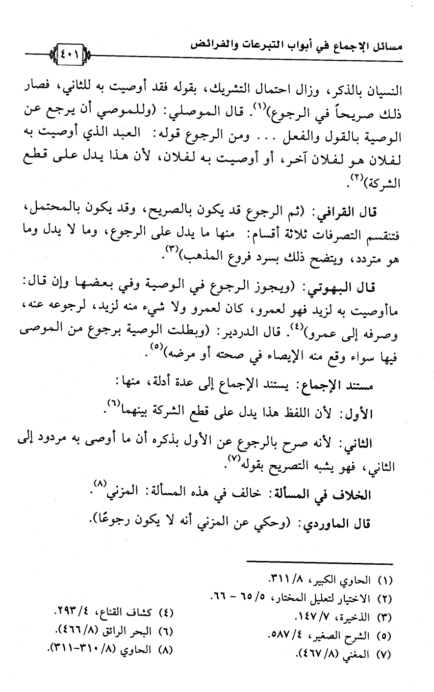 قال البهوتي: (ويجوز الرجوع في الوصية وفي بعضها وإن قال: ما أوصيت به لزيد فهو لعمرو، كان لعمرو ولا شيء منه لزيد، لرجوعه عنه، وصرفه إلى عمرو) (¬4). قال الدردير: (وبطلت الوصية برجوع من الموصى فيها سواء وقع منه الإيصاء في صحته أومرضه) (¬5).