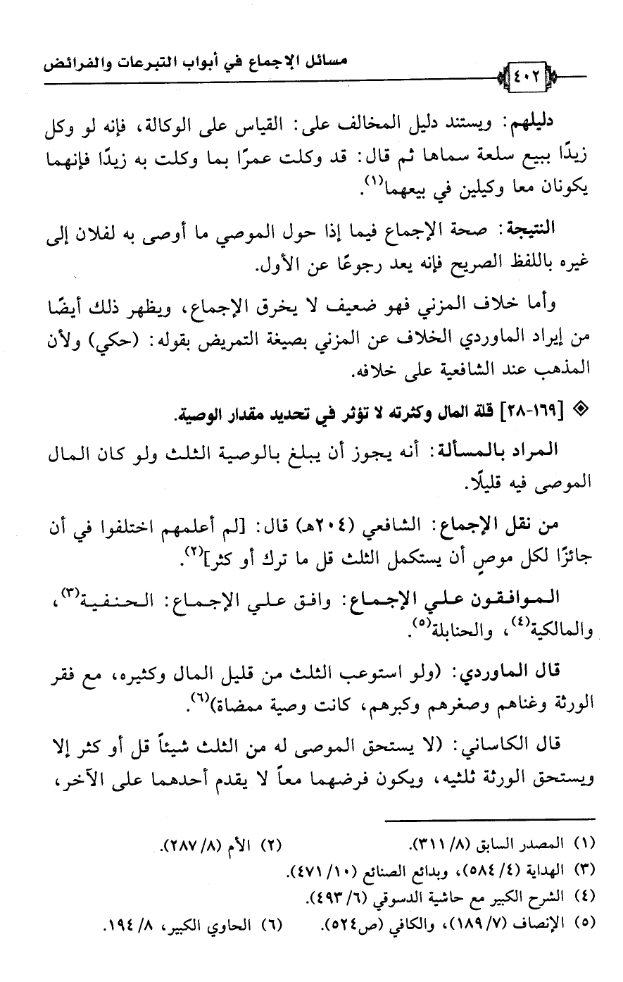 • من نقل الإجماع: الشافعي (204 هـ) قال: [لم أعلمهم اختلفوا في أن جائزًا لكل موصٍ أن يستكمل الثلث قل ما ترك أو كثر] (¬2).