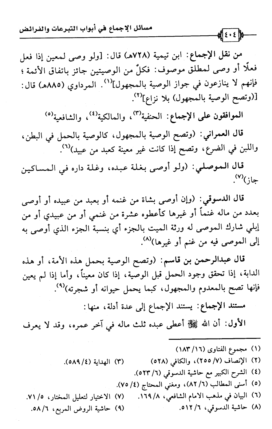 • من نقل الإجماع: ابن تيمية (728 هـ) قال: [ولو وصى لمعين إذا فعل فعلًا أو وصى لمطلق موصوف: فكل من الوصيتين جائز باتفاق الأئمة؛ فإنهم لا ينازعون في جواز الوصية بالمجهول] (¬1). المرداوي (885 هـ) قال: [(وتصح الوصية بالمجهول) بلا نزاع] (¬2).