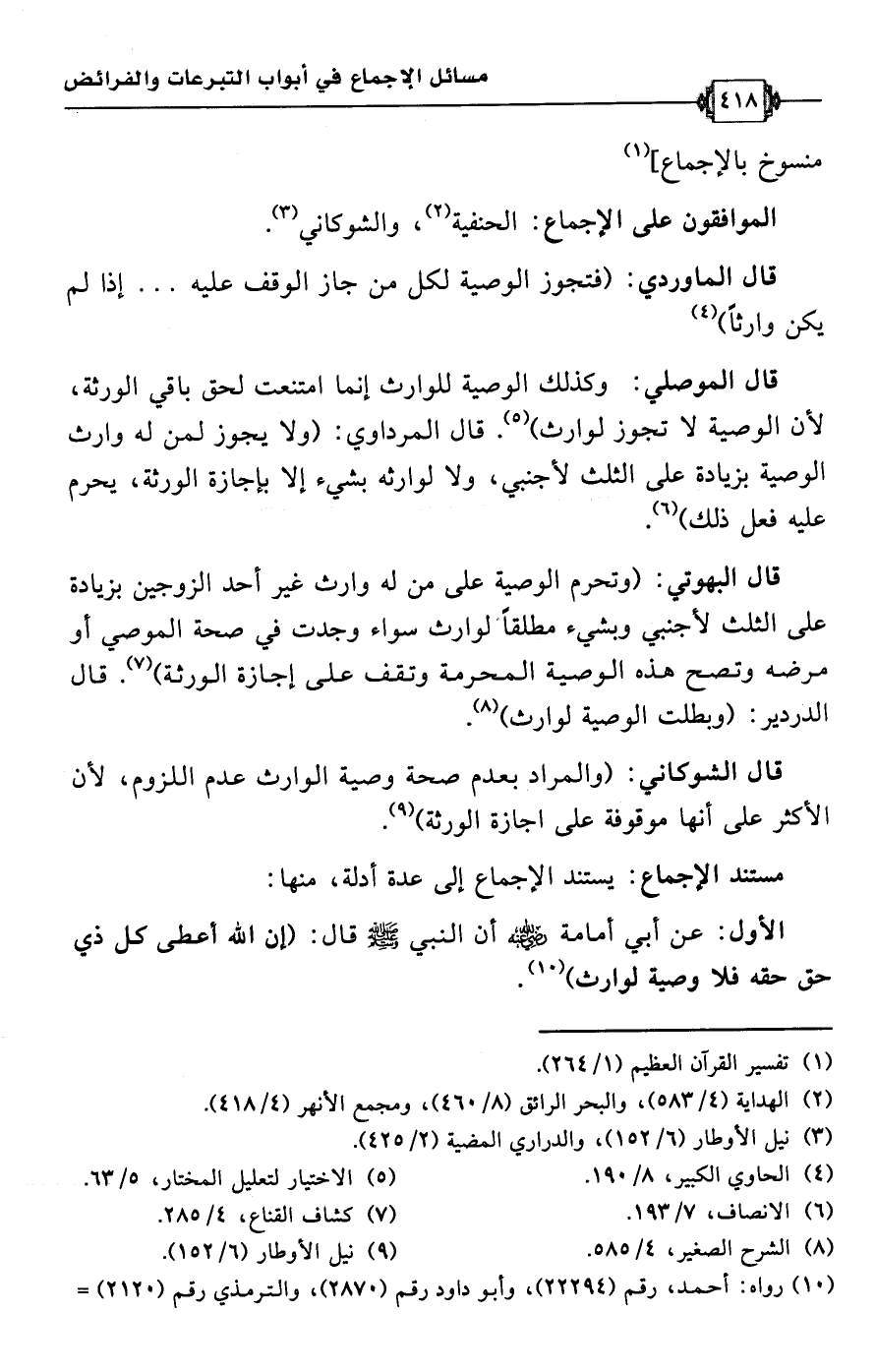 الأول: عن أبي أمامة -رضي اللَّه عنه- أن النبي -صلى اللَّه عليه وسلم- قال: (إن اللَّه أعطى كل ذي حق حقه فلا وصية لوارث) (¬10).