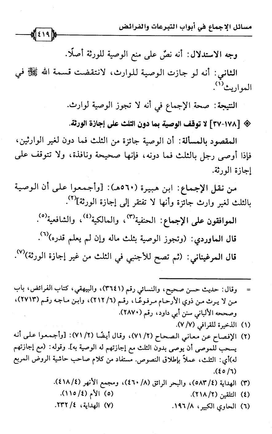 (¬2) الإفصاح عن معاني الصحاح (2/ 71)، وقال أيضًا (2/ 71): [وأجمعوا على أنه يسحب للموصى أن يوصى بدون الثلث مع إجازتهم له الوصية به]. وقوله: (مع إجازتهم له) أي: الثلث، عملًا بإطلاق النصوص. مستفاد من كلام صاحب حاشية الروض المربع (6/ 45).