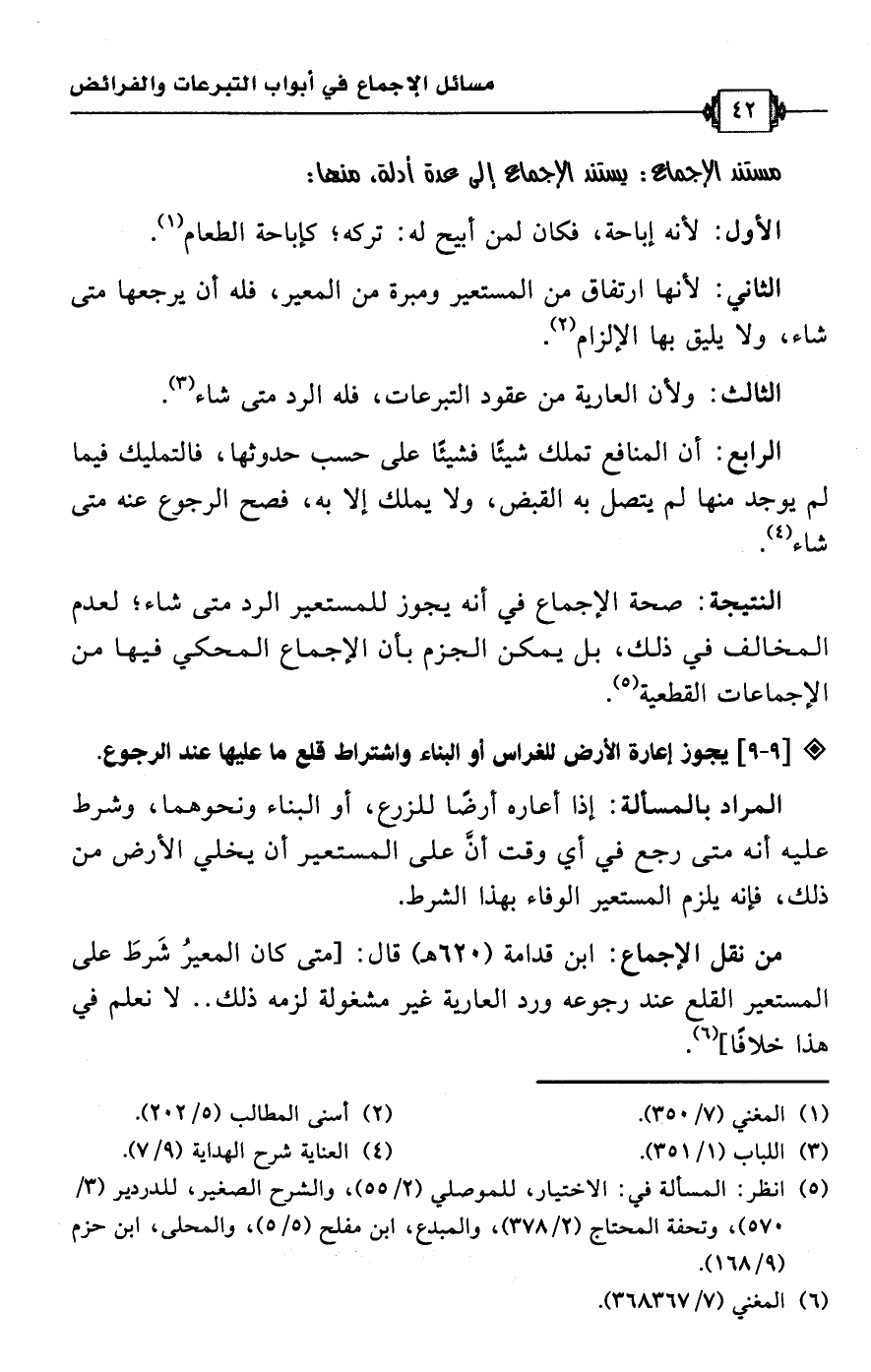 الرابع: أن المنافع تملك شيئًا فشيئًا على حسب حدوثها، فالتمليك فيما لم يوجد منها لم يتصل به القبض، ولا يملك إلا به، فصح الرجوع عنه متى شاء (¬4).Rصحة الإجماع في أنه يجوز للمستعير الرد متى شاء؛ لعدم المخالف في ذلك، بل يمكن الجزم بأن الإجماع المحكي فيها من الإجماعات القطعية (¬5).