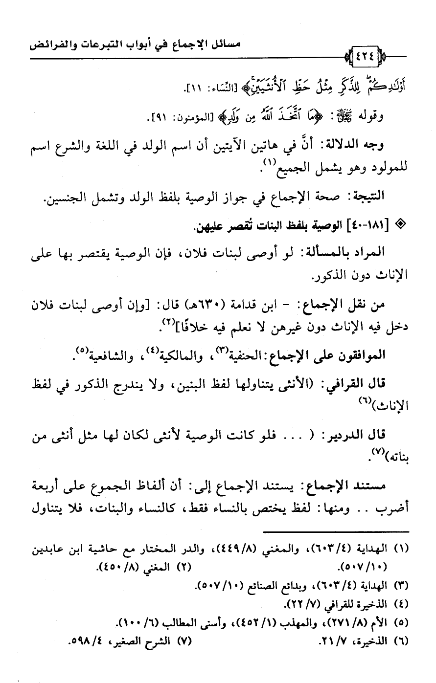 • من نقل الإجماع: ابن قدامة (630 هـ) قال: [وإن أوصى لبنات فلان دخل فيه الإناث دون غيرهن لا نعلم فيه خلافًا] (¬2).