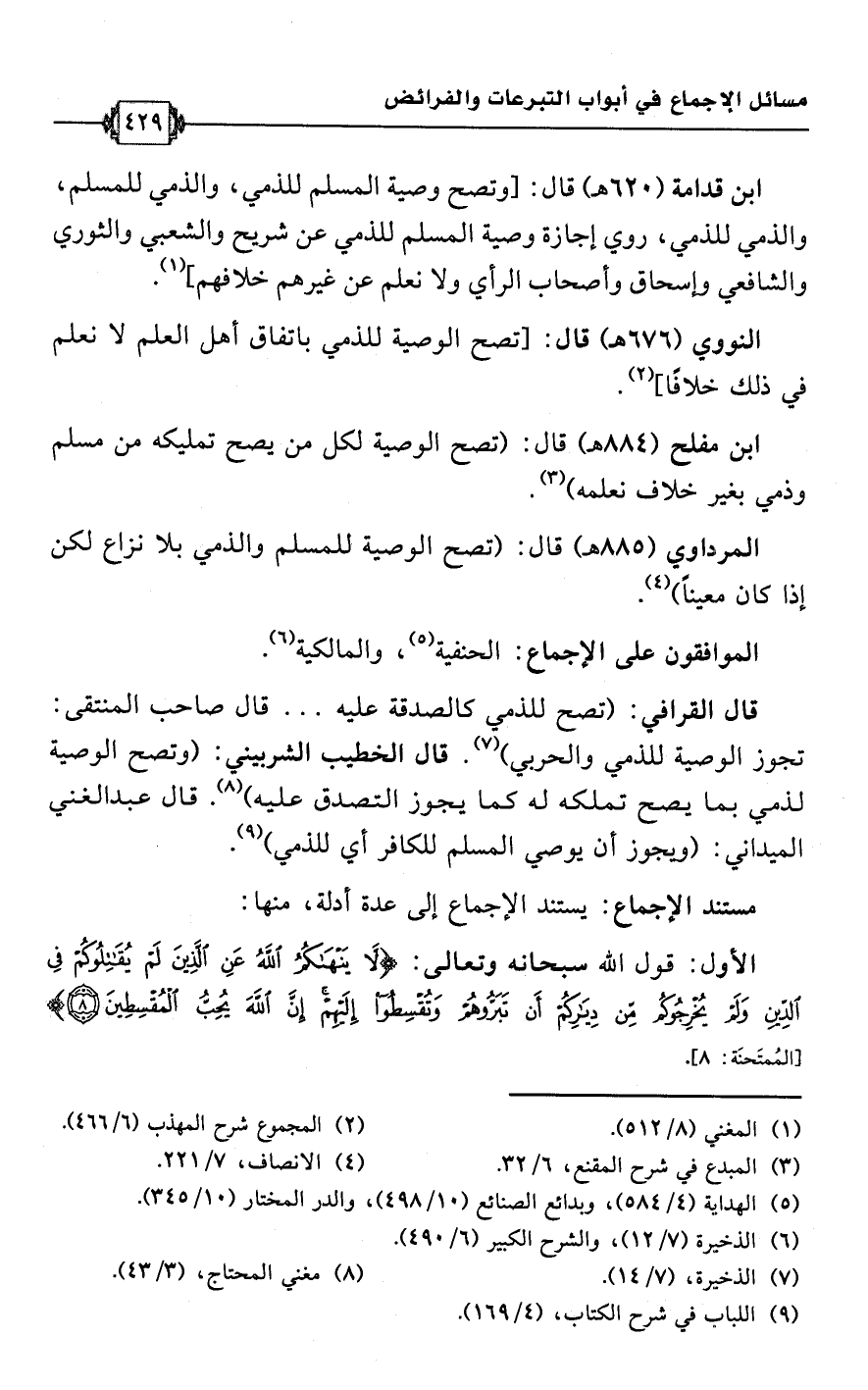 ابن مفلح (884 هـ) قال: (تصح الوصية لكل من يصح تمليكه من مسلم وذمي بغير خلاف نعلمه) (¬3).